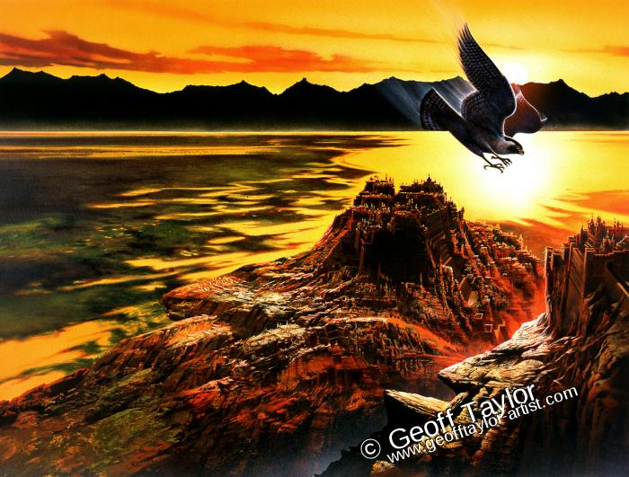A deep yellow sky with red clouds herald a setting sun, in this painting by Geoff Taylor, making a silhouette of the mountain range that will mask it. A falcon is backlit with the full ray of the sun as it flies over a fortress and city built on and into a massive rock close to the edge of the sea. On the opposite mountain outcrop, another fortress has been built with a crevasse separating the them.